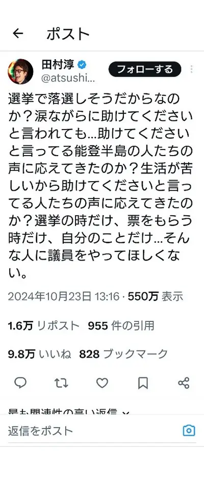 田村淳さん、選挙で落選しそうな候補の"助けて下さい"に「助けてくださいと言ってる能登半島の人たちの声に応えてきたのか?」