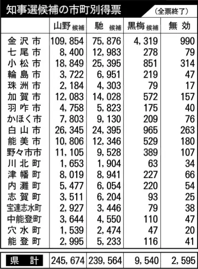 【速報】震災後初の石川県知事選挙、新人の山野之義氏が現職の馳浩を抑え当選確実「6110票差」