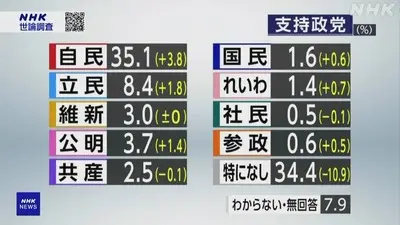 【速報】NHK世論調査、発表「立憲+1.8増!!政権交代あるぞ!!」自民「+3.8増です」