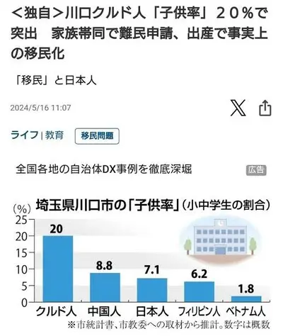 【速報】川口市ガチで時間の問題だと判明 小中学校割当でクルド人の子供率20%で突出「中国人8.8、日本人7.1、比6.2」