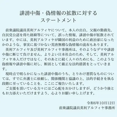 【速報】英利アルフィヤ氏「隣国の利益のために政治家になったかのようなデマ拡散や誹謗中傷について」法的措置の準備に入っていることを発表