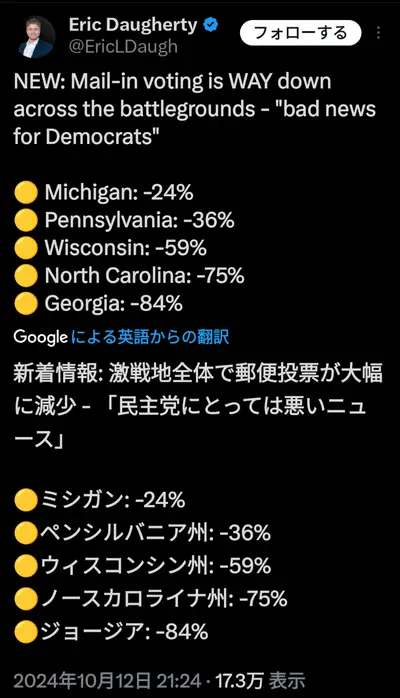 【悲報】ハリス「郵便投票がめちゃくちゃ減ってるの!このままじゃジャンプできないわ!」