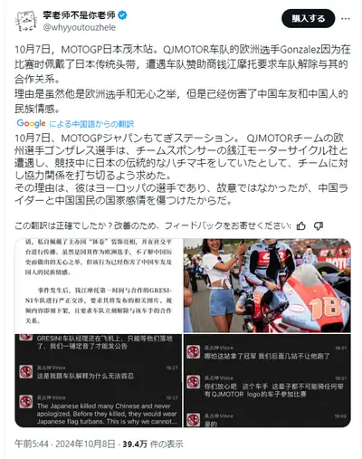 【速報】伊バイクレーサー、日章旗の鉢巻を付ける→中華スポンサーがブチギレて解雇要求→チーム「お前が消えろ、こっちから解除だ」「現在進行形で弾圧に加担している国家が言うな」