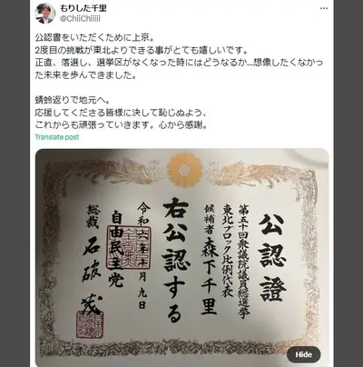 元グラビアアイドル森下千里(43)、自民党比例東北ブロック公認(名簿上位)で当選確実へ