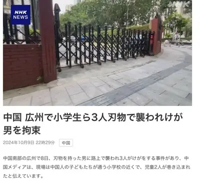 【速報】日本総領事館が注意喚起 中国の小学校前で小学生ら3人刺される 犯人逮捕「動機は不満のはけ口」