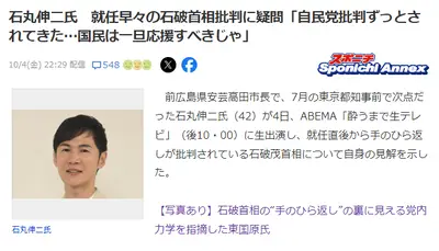 【速報】石丸伸二氏 就任早々の石破首相批判に疑問「自民党批判ずっとされてきた、国民は一旦応援すべきじゃ」