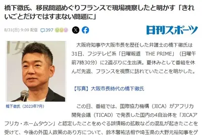【速報】橋下徹氏「フランスに視察し移民問題の悲惨な実態を見てきました。これは、きれいごとだけではすまない」