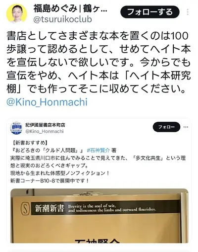 【速報】福島めぐみ市議「クルド人ヘイト本を宣伝するんじゃねぇ!」→紀伊國屋書店謝罪、削除