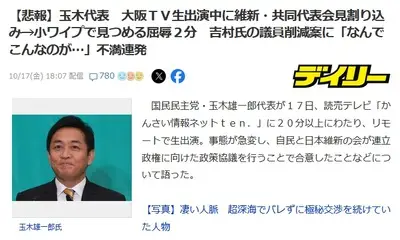 国民・玉木 TV出演中に『あ、お話の途中ですが維新の会見です』とブチ切られ屈辱のワイプ中継