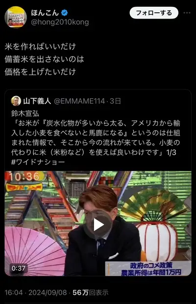 ほんこん「コメは作りゃ良いだけ。備蓄米出せば良いだけ。値段釣り上げるな」米農家「ほんこんさん…」