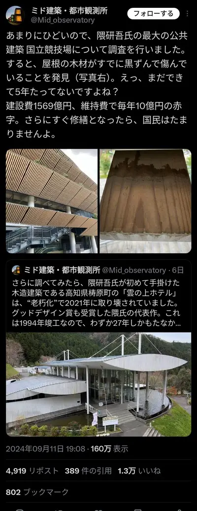 【画像】まだたった5年しか経っていない新国立競技場、朽ち始めるwwwwwwww