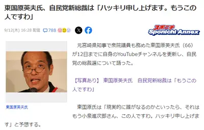 【速報】石破茂を推す東国原英夫氏、自民党新総裁は「それはもう小泉進次郎さん、この人ですわ。ハッキリ申し上げます」
