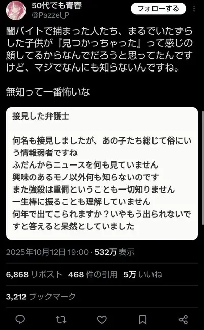 闇バイト「何年で出られそうですですか?」弁護士「恐らく一生刑務所です」闇バイト「え、そうなの?」