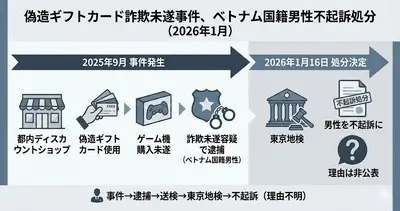 【東京地検】ベトナム国籍、偽造ギフトカードでゲーム機購入しようとするも失敗して逮捕も不起訴でノーダメージwww