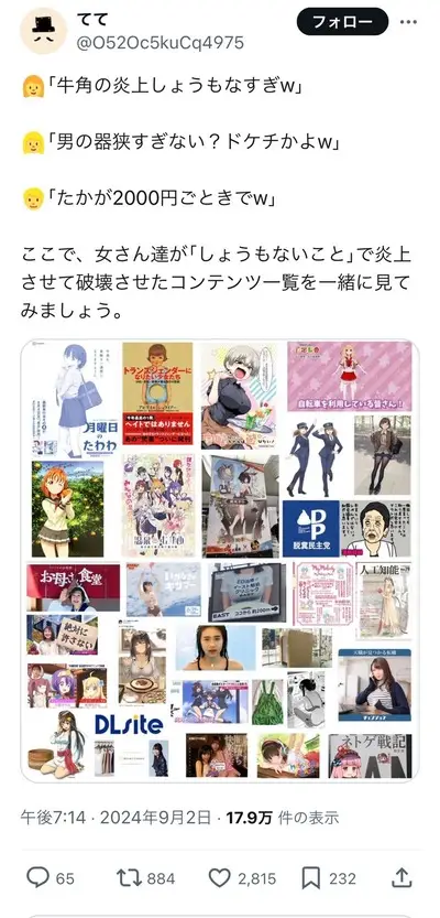 【画像】女「牛角の炎上しょうもなw男の器狭すぎw」→男「フェミさんが炎上させてきたコンテンツ一覧がこちら」