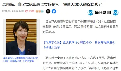 【速報】高市早苗、推薦人20人確保完了 前回は岸田首相に次ぐ国会議員票を獲得した大本命!!
