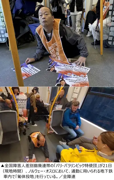 韓国の障害者団体がノルウェーの地下鉄で抗議の匍体投地、ソウル市長の写真バラ撒き「市長は障害者の人権弾圧やめろ!」