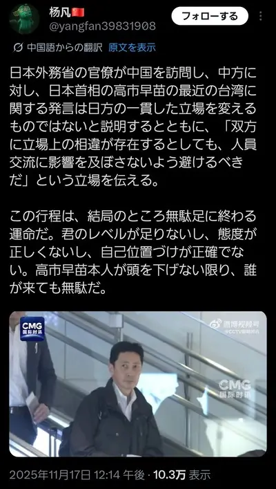 中国「外務省幹部なんてよこしても無駄だ!高市本人が直接謝罪に来るまで許さない」