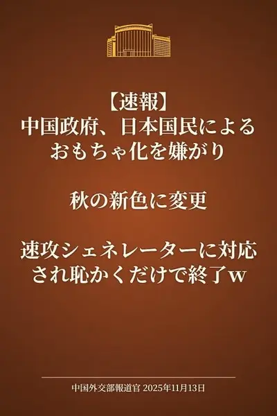 【速報】中国政府、日本国民によるおもちゃ化を嫌がり秋の新色に変更→速攻シェネレーターに対応され恥かくだけで終了w