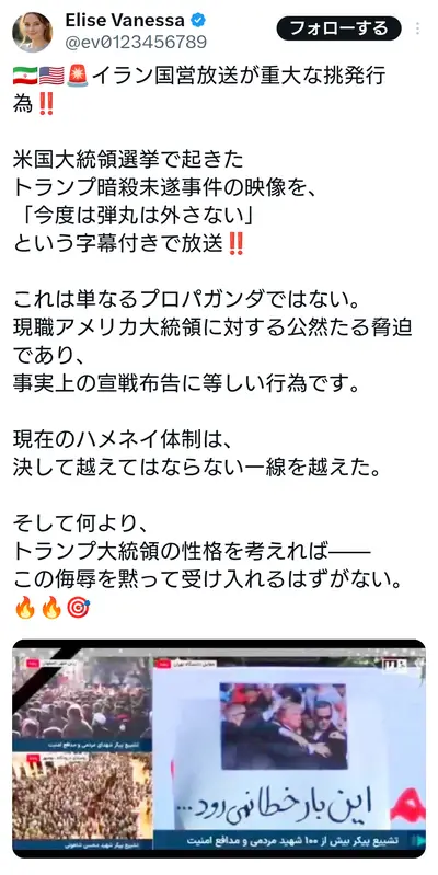 【速報】イラン国営放送がトランプ大統領に宣戦布告「かかってこいやトランプ!頭部に弾丸食らわしてやる」