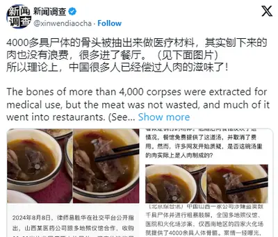 【中国】4,000体以上の人間の遺体から骨を医療用採取、肉はレストランで利用していることが発覚 中国で大騒動となっている模様