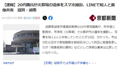 公務員「火葬場の遺体の写真を撮りました~!みんな見て見て~」→市役所「言語道断!」