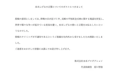 水木しげるさん生前の言葉伝える投稿削除「タイミングが不適切」と指摘 長崎平和式典の直後