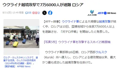 ロシア、ウクライナの越境攻撃で7万6000人が避難 国営原子力大手はクルスク原子力発電所への 「直接的な脅威」警告
