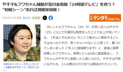 【速報】騒動が寄付金着服「24時間テレビ」の低視聴率を救う可能性 今年のマラソンはやす子、フワちゃん登場で生和解案www