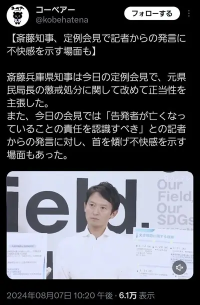 【悲報】記者「人が死んでんねんで!」兵庫県知事斎藤「……?」無言で首をかしげる