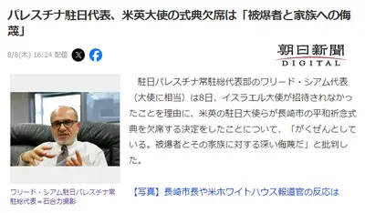 【速報】パレスチナ駐日代表、米英大使の式典欠席は「被爆者と家族への侮蔑」