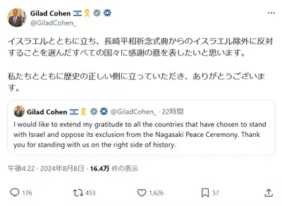 イスラエル大使「長崎平和式典をボイコットした国々に感謝。共にに歴史の正しい側に立って頂いた」