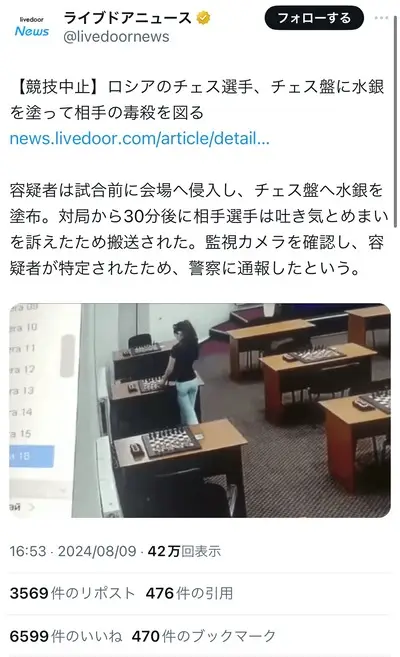 【悲報】ロシアのチェス選手、チェス盤に水銀を塗って相手の毒殺を図る