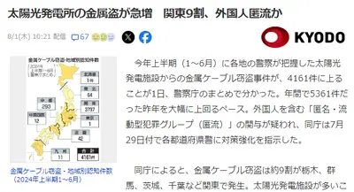 【悲報】太陽光発電所の乱立のせいで治安悪化が深刻「昨年を大幅に上回るペース」 外国人犯罪者の小遣い稼ぎの場となっただけだった模様・・・