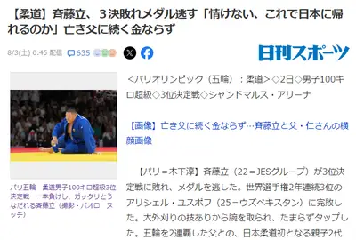 【パリ五輪】斉藤立「情けない、これで日本に帰れるのか」亡き父に続く金ならず 重量級女子素根も骨挫傷再発で棄権