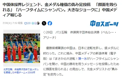 中国体操界レジェンド、金メダル確信し鉄棒の直前に『金メダルおめでとう』とシャンパンあける画像投稿→日本が金メダル→中国報道「顔面を殴られた」