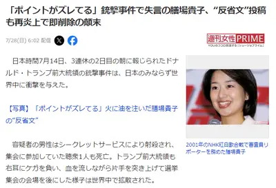 【サンモニ】トランプ銃撃事件失言の膳場貴子、反省文が再炎上後の「次の対応」がゴミ過ぎて無限ループ突入wwww