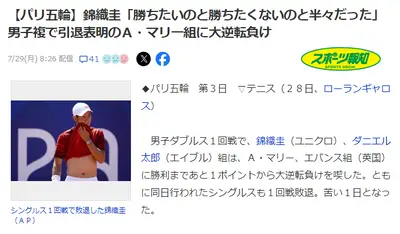 【パリ五輪/テニス】錦織圭、ダブルスで1回戦敗退「勝ちたいのと勝ちたくないのと半々だった」ダニエル太郎「・・・」※同日シングルスも1回戦敗退