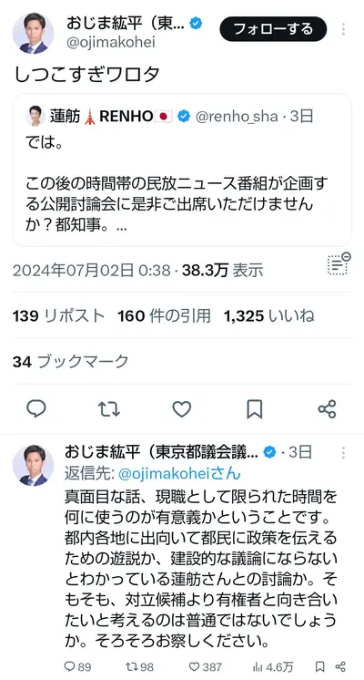 蓮舫「小池百合子、討論会を!」都ファ幹事長おじま紘平「しつこすぎワロタ」