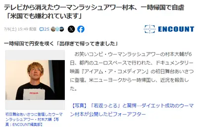 【悲報】ウーマン村本、貯金が底をつき帰国「出稼ぎで帰ってきました」 米国でも同僚に嫌味を言って嫌われている模様
