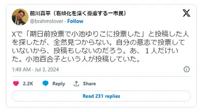前川喜平さん「小池に期日前投票した人を探したが全然いない。あ、一人いた。小池百合子という人だ」