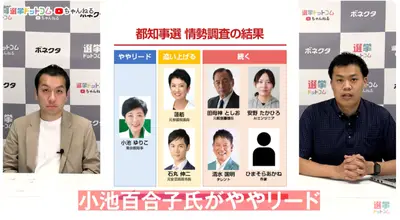 【都知事選情勢調査】最新・小池百合子氏ややリード、蓮舫氏と石丸氏追い上げ、田母神氏、安野氏、清水氏、ひまそらあかね氏が続く!!