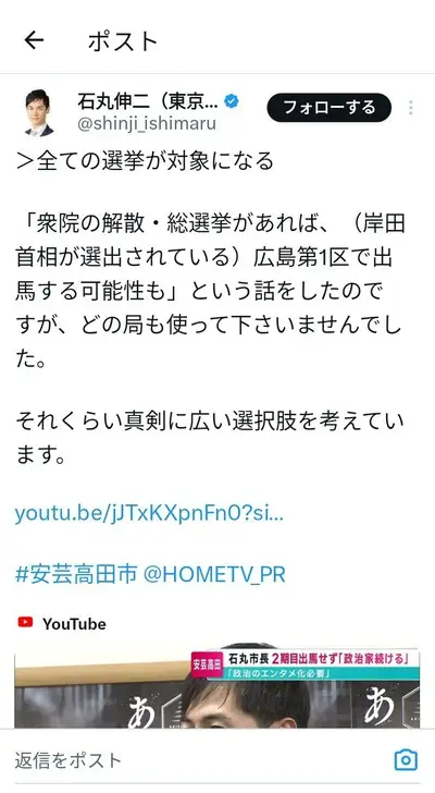 【速報】東京都知事選出馬の石丸氏「解散・総選挙があった場合、広島第1区で岸田首相に挑むwwww」