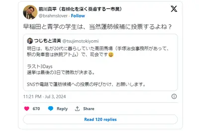 【悲報】蓮舫陣営幹部、ガチで蓮舫の足を引っ張る SNSで投稿「早稲田と青学の学生は、当然蓮舫候補に投票するよね?」