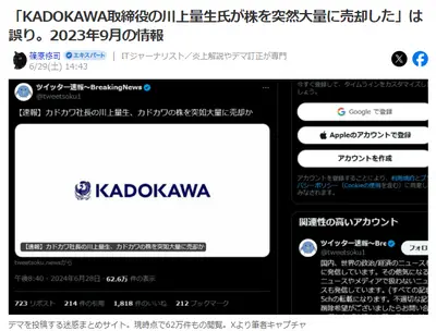 【悲報】5ch、川上が株大量売却したとデマスレでYahoo!登場、スレ主は勘違いと謝罪もすでに拡散