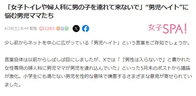 【男児ヘイト激化】「女子トイレや婦人科に男の子を連れて来ないで」