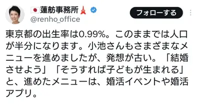 【悲報】蓮舫・事務所、東京の合計特殊出生率0.99を「出生率0.99%」と書いてしまう