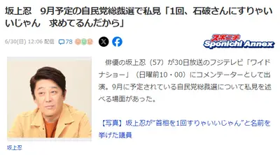 【ワイドナショー】坂上忍 9月予定の自民党総裁選で私見「1回、石破さんにすりゃいいじゃん 求めてるんだから」