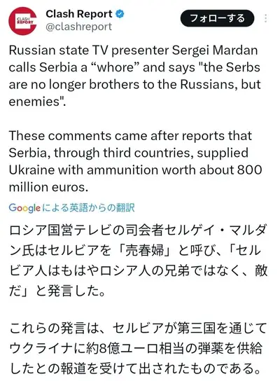 【悲報】ロシア国営テレビ「セルビアはロシアの子分のくせにウクライナを支援した!セルビアは敵だ!」