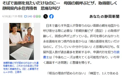 在日韓国人、韓国の家を失った母(不安症・うつ病・高血圧・糖尿病持ち)を日本に呼び寄せ→入管「在留資格の不許可、来月帰国ね」在日「親の面倒を見たいだけなのに何故!?」
